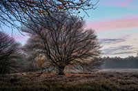 Landschap op de Wolfhezerheide, in Doorwerth, op de Veluwe in Gelderland. Het is een koude ochtend in de late herfst. Je ziet een oude boom. Hier is gebruik gemaakt van meervoudige belichting, waar verschillende foto's worden samengevoegd in de camera. Het zorgt voor een kunstig en schilderachtig effect.