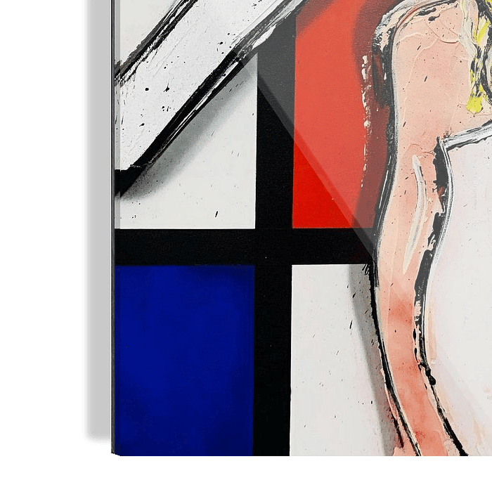 Haar zachte, organische vorm lijkt te breken met de strakke lijnen en blokken van Mondriaans wereld, terwijl ze dromerig lijkt op te gaan in het abstracte landschap achter haar. Het contrast tussen haar ronde vormen en de rechte lijnen van de compositie benadrukt de spanning tussen het mechanische en het natuurlijke, tussen orde en spontaniteit. Dit spel van tegenstellingen symboliseert de delicate balans tussen structuur en vrijheid, terwijl de vrouw als een symbool van verbeelding en poëzie lijkt weg te glijden in de strakke, doch tijdloze wereld van Mondriaan.