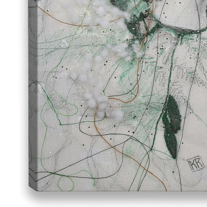 Een figuratief werk in winterse sfeer, een portret van draad & textiel met 'vlokjes' van goud & sneeuw.