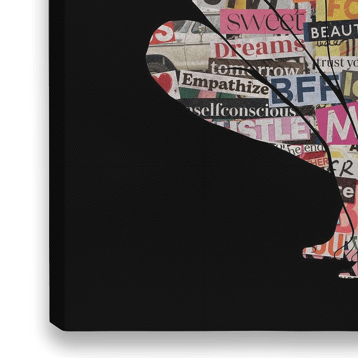Een collage van papierknipsels met woorden, gereflecteerd op een vrouw.