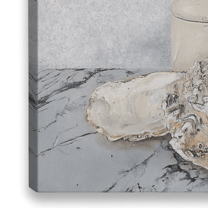 Een klassiek stilleven van een luxe tafereel: witte wijn en oesters. Het origineel is geschilderd met olieverf.