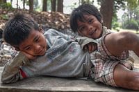 Twee vriendjes van het platteland in Siem Reap poseren vrolijk voor de foto.