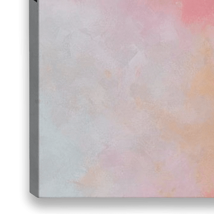Een serene compositie waarin pastelroze, hemelsblauw en perzikoranje zacht in elkaar overvloeien. In het midden lichten flarden lavendel en fuchsia op, als een dromerig centrum van energie. De lijnen zijn subtiel gebarsten, als gedroogd pigment of glanzend marmer, met hier en daar een vleugje goud dat het beeld diepte geeft.