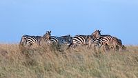 Een groep zebra's graast in de Masai Mara in Kenia vlak voor zonsondergang.