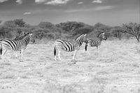 Vier zebra's in Etosha National Park in Namibië, gefotografeerd in zwart-wit.