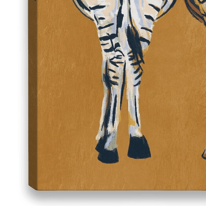 Een digitaal schilderij van twee kleurrijk gestreepte zebra's vanaf de achterkant op een goudgele achtergrond.