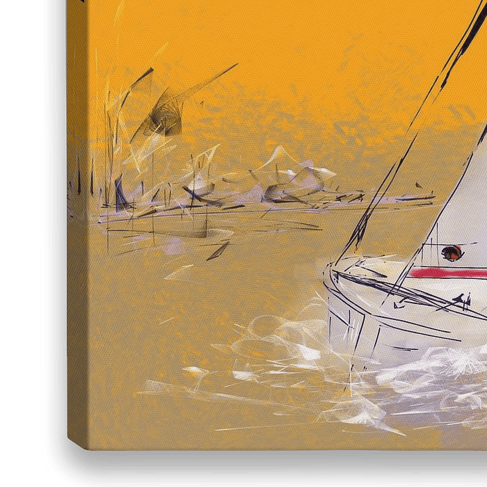 In een geeloranje gloed verschijnen drie zeilboten. Alles is met een pen getekend met schetsmatige lijnen. Met wat rood zijn de zeilen ingekleurd. Het…