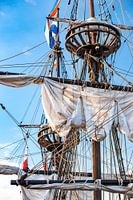 Detail van de mast van het schip. Gedetailleerd tuigage met zeilen. Woud aan scheepsmasten met kraaiennest als uitkijkpost en oude vintage zeilen die gehezen in de mast hangen. Details van een oude Hollands VOC schip uit de historische geschiedenis van Nederland
