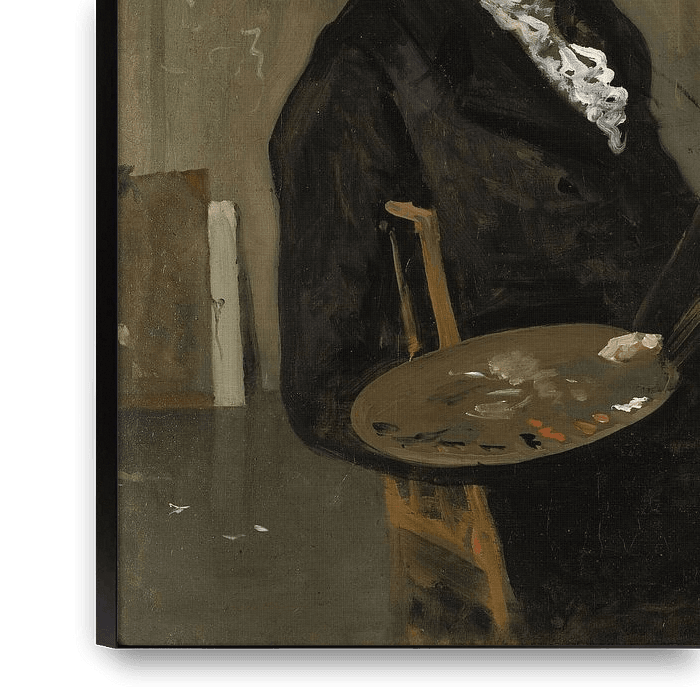 De veelbelovende schilder Wouter van Troostwijk zou jong gestorven zijn aan een verkoudheid die hij 's nachts tijdens het tekenen buiten zou hebben opgelopen. Het leven van een kunstenaar kan nauwelijks romantischer eindigen dan dat van een kunstenaar! Zijn atelier is afgebeeld in dit informele zelfportret, dat hij kort voor zijn dood maakte. Bovenop de kast staan gipsen afgietsels van klassieke beeldhouwwerken gegroepeerd, de modellen die traditioneel door een schilder worden gebruikt.