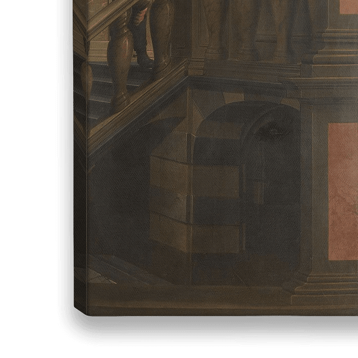 Onderdeel van een zevendelige kamerbeschildering in vijf stukken met afbeeldingen van een interieur, twee galerijen en twee buitentrappen, bevolkt met talrijke personen.