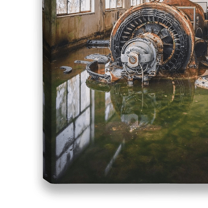Dit is een foto die ik genomen heb bij een elektriciteitscentrale die aan een meer ligt, en mede daardoor en hevige regenval de indruk geeft dat deze aan het zinken is. Het water op de vloer geeft het effect van een mooie reflectie. Alles lijkt flink te roesten.