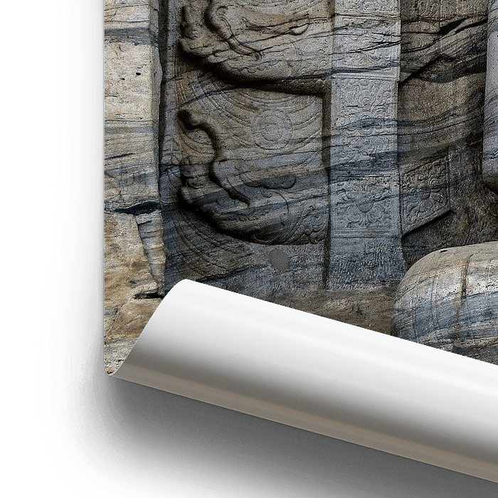 Zittende Buddha met lange oren, Sri Lanka. Een van de 4 granieten beelden van De Gal Vihara. Een laantje langs een waterbekken leidt naar de Gal Vihara, de beroemde rotstempel met vier enorme uit de granieten rots gehouwen beelden uit het midden van de 12de eeuw. In de rotswand zijn inscripties aangebracht. Oorspronkelijk maakte de rotstempel deel uit van een kloostercomplex uit de tijd van Parakrama Bahu i, het Uttararama (noordelijk klooster). Met het gezicht naar de tempel gekeerd ziet u links de zittende Boeddha in meditatie en achter hem een soort stralenkrans van beeldhouwwerk. Dan volgt, rechts, een eenvoudige zuilengalerij die toegang geeft tot het beeldenhuis in de rots, met beelden van Boeddha en enkele hindoegoden. Voor de zuilengalerij heeft men een bo-boom geplant.