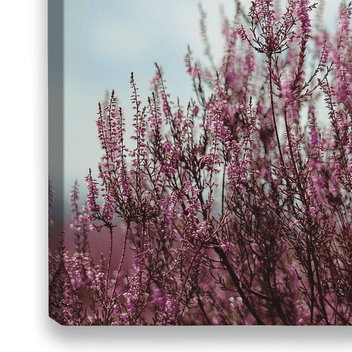 Deze betoverende foto neemt ons mee naar een zomerse dag, waar de heide in volle bloei staat en een zee van prachtige kleuren vormt. Het landschap wordt gedomineerd door paarse en roze tinten, die zich uitstrekken zover het oog reikt.