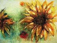 Zomer, Zon, Zonnebloem. De goudgele kleuren van de zonnebloemen zijn hier geschilderd met oliepastelkrijt. Zonnebloemen met hun prachtige bloembladeren die als stralen van de zon zijn. Zij geven hoop en kleur aan de soms moeilijke tijden, het is een optimistische bloem die straalt maar als zij is uitgebloeid is zij triest , laat haar…