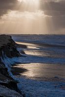 Zonneharpen breken door de donkere wolken boven een woelige deining van een noordwester storm. De duinen zijn weggeslagen door de branding tussen Katwijk en Noordwijk aan zee.