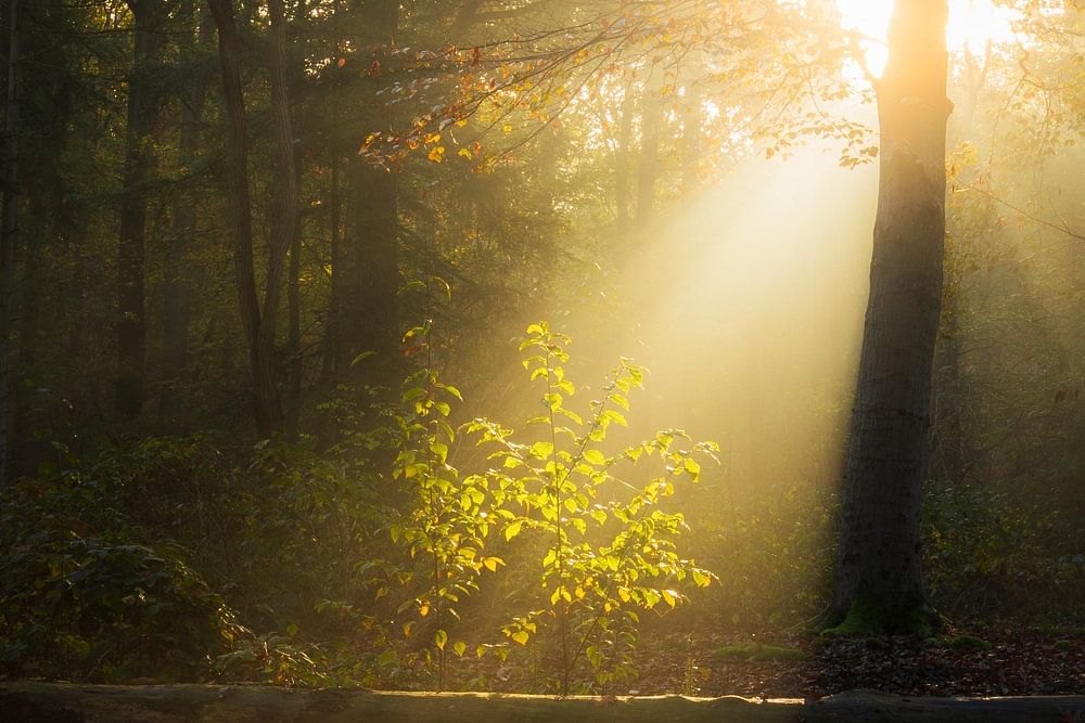 Op een mistige herfstochtend in het bos van de Oude Warande in Tilburg, Noord-Brabant, werd ik getrakteerd op een spectaculair lichtspel. De zon stond laag en verscholen achter een boom, waardoor een krachtig silhouet ontstond. Zonneharpen baanden zich een weg door de mist en vielen tussen de bomen door, terwijl het zachte licht de groene bladeren op de voorgrond subtiel belichtte. De mix van donker en licht creëerde een intens contrast dat het beeld een bijna magisch effect gaf.