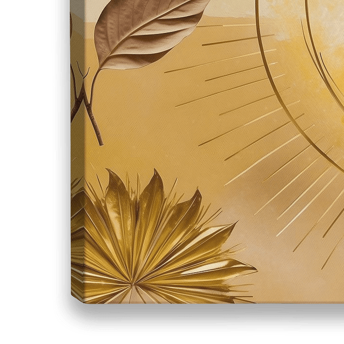 Deze spirituele compositie is een ode aan balans: de zon als symbool van levenskracht, cyclisch ritme en eeuwige transformatie. Rondom de cirkel vloeien natuurlijke elementen samen, zoals gebarsten aarde, bladeren en lichtflarden — symbolen van groei, vergankelijkheid en verbondenheid.