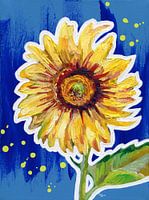 Schilderij van een zonnebloem op een blauwe achtergrond met lichtgroene verfspetters.