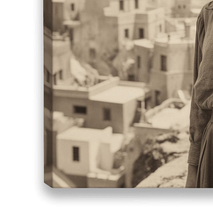 Het portret toont een jonge vrouw die ernstig en gefocust in de camera kijkt. Haar uitdrukking is kalm maar vastberaden, alsof ze het gewicht van haar omgeving voelt. Haar eenvoudige, landelijke kleding - een los overhemd en een wijde rok - weerspiegelt de eenvoud van haar leven, terwijl het zachte zonlicht haar gelaatstrekken zachtjes…