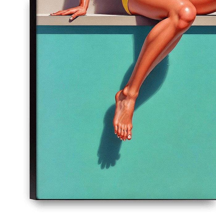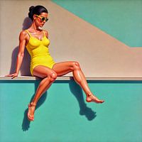 Dit werk vangt een moment van serene elegantie en moderne eenvoud. De vrouw, zittend op de richel, belichaamt een balans van zelfvertrouwen en introspectie. Haar felgele badpak en zonnebril zijn niet alleen modestatements maar ook symbolen van levendigheid en individualiteit, die opvallen tegen de gedempte, geometrische achtergrond. Het…