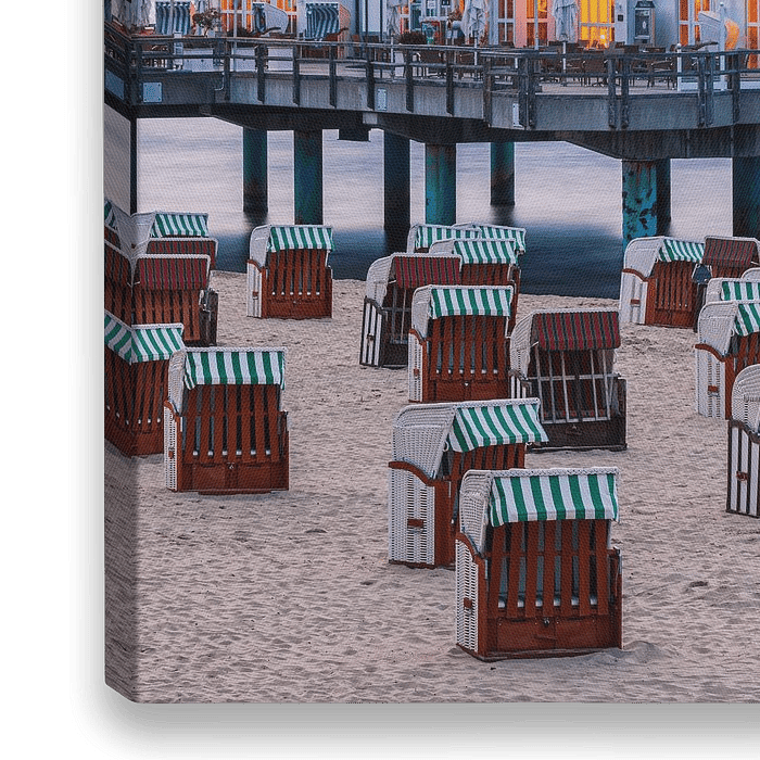 Zonsondergang bij de Sellin Pier (Duits: Seebrücke Sellin) in de Baltische badplaats Sellin op het Duitse eiland Rügen. De pier heeft een restaurant vlakbij het strand boven het water en heeft een duikgondel.