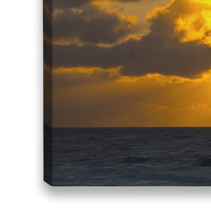 Zonsondergang bij De Koog, Texel aan de Noordzee-zijde, Strandpaviljoen Paal 19. Oranje zonnestralen. Donkere wolken. Aan het strand uitkijkend over zee.