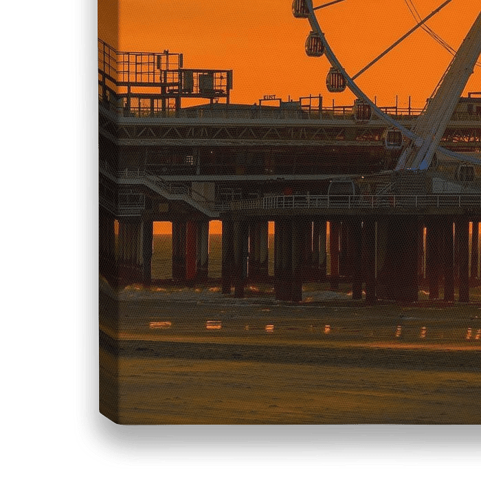Zonsondergang bij Scheveningse Pier, Noordzeekust, Nederland ; bungy jump, reuzenrad SkyView; Giant Wheel. Mooie rood-oranje zonsondergang
