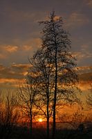 Een sterk oranje gekleurde zonsondergang in het Friese landschap met bomen zonder bladeren op de voorgrond nabij het dorp Westereen.