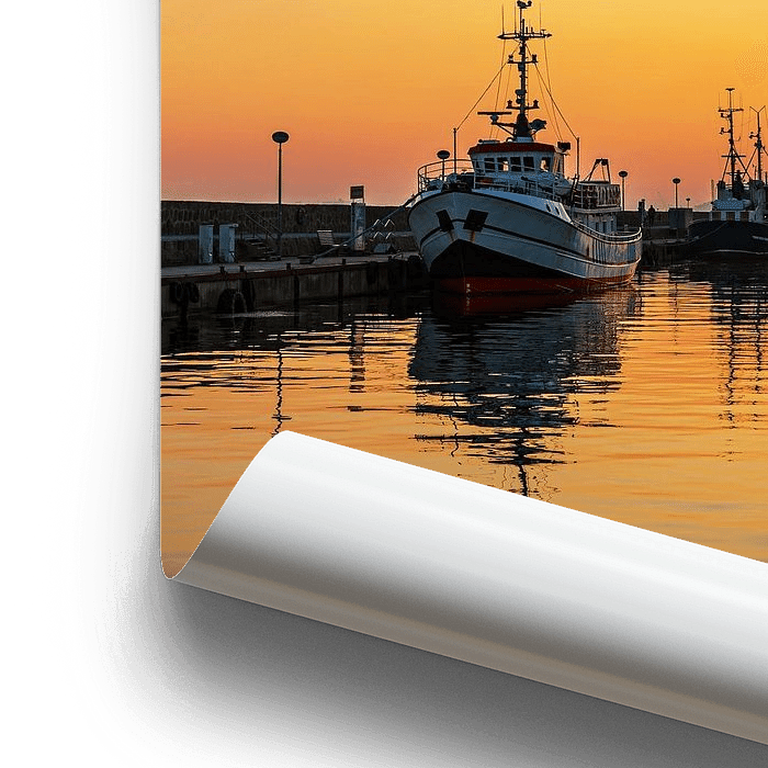 Koop de foto Zonsondergang en vissersboten in de haven van de stad Sassnitz op van Rico Ködder op canvas, aluminium dibond, (ingelijste) fotoprint, behang en ArtFrame, op maat geprint in Fine-Art kwaliteit.
