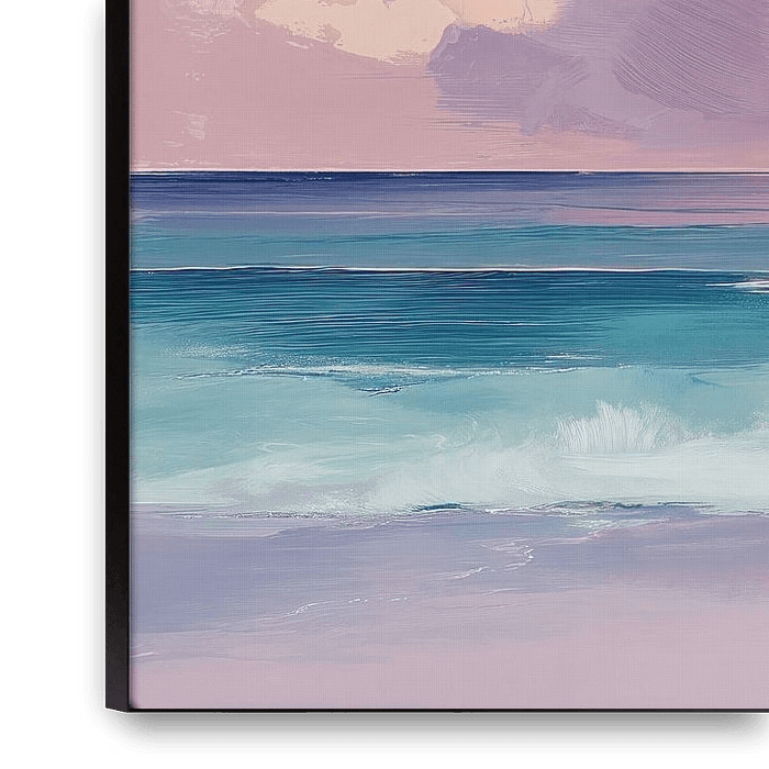 Een kunstwerk waarin zacht roze, goud en turquoise elkaar omhelzen in een serene zonsondergang. De schilderkunst combineert dromerige wolkenformaties met golfslag in aquareltechnieken, creëerend een moment van pure rust en contemplatie. Dit werk ademt minimalistische schoonheid en emotionele diepgang uit, perfect voor wie innerlijke…