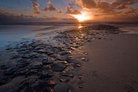 Op de foto zie je een strekdam bij Camperduin, Noord-Holland. De zon gaat onder en zorgt voor een mooie reflectie op de stenen van de strekdam.