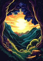 Dit artistieke landschapsmotief toont een spectaculaire zonsopgang, omlijst door majestueuze bomen die een natuurlijke omlijsting vormen voor het uitzicht op een brede vallei. De stralende zon domineert de lucht en verlicht deze in warme tinten geel en oranje. Zacht gebogen bergketens in blauwe en groene tinten lopen door het beeld en…