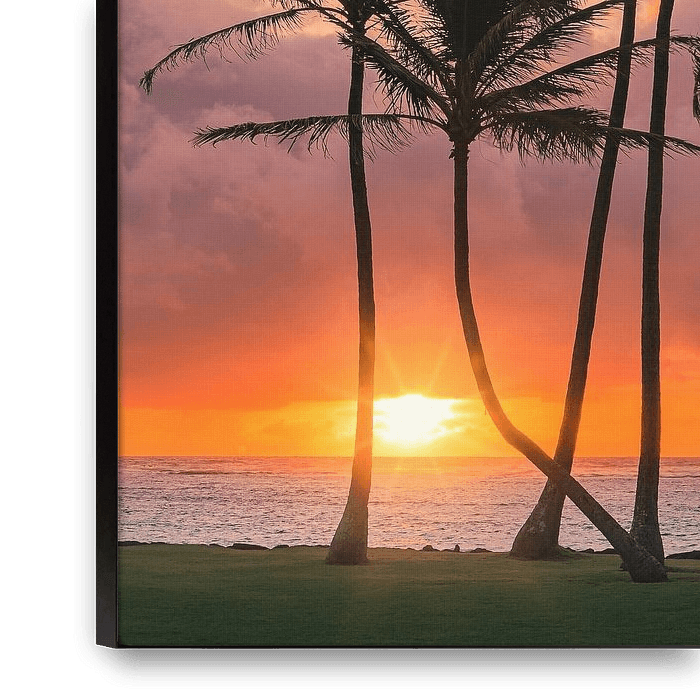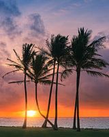 Een verticale 4:5 foto van een kleurrijke zonsopkomst bij Kapaa strandpark met palmbomen, uitkijkend over de grote oceaan.