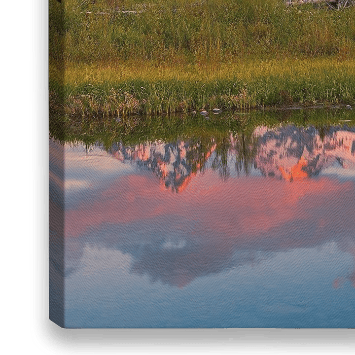 De Snake River stroomt kalm op de voorgrond en weerspiegelt de levendige kleuren van de lucht en de omliggende bergtoppen. Cumulus- en cirruswolken vangen het vroege zonlicht en…