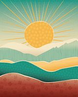Abstract-minimalistisch landschap met velden die zich uitstrekken tot bergen in de verte en de opkomende zon met iconische zonnestralen op de achtergrond. De kleuren - varianten van geel, oranje, rood, groen en turquoise - staan voor het contrast tussen de warmte van de zon en de koele schaduwen van de nacht. Verschillende grafische elementen en texturen zorgen voor interessante effecten.