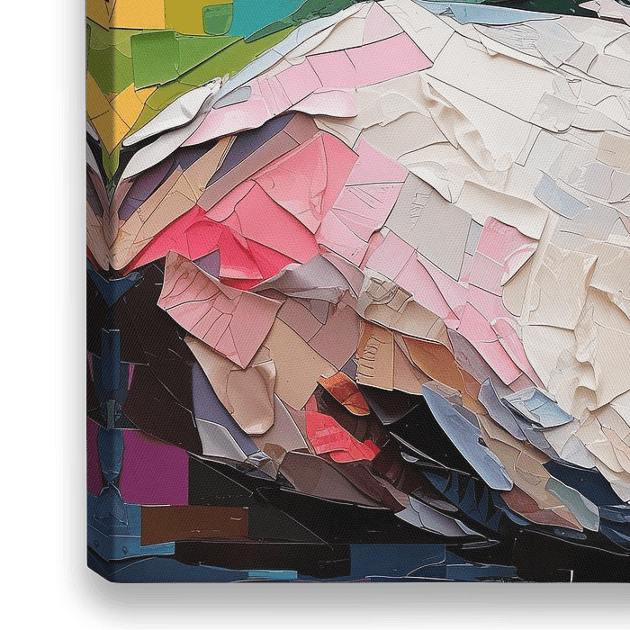 Zwaan | Abstracte Zwaan | Neon - Dit levendige kunstwerk toont een zwaan in neon kleuren, geconstrueerd uit een lappendeken van kleurrijke, geometrisch gevormde stukken. De wisselwerking tussen de gedetailleerde textuur van het veerwerk en de abstracte achtergrond doet denken aan een moderne collage-stijl, geaccentueerd met tinten roze,…
