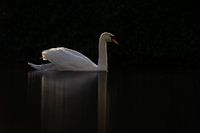 Een zwaan in rustig water waar weinig licht is en een zeer serene sfeer geeft. het randje licht om de contouren van de zwaan maken het geheel af. Het wit van de zwaan komt mooi uit in de donkere achtergrond.