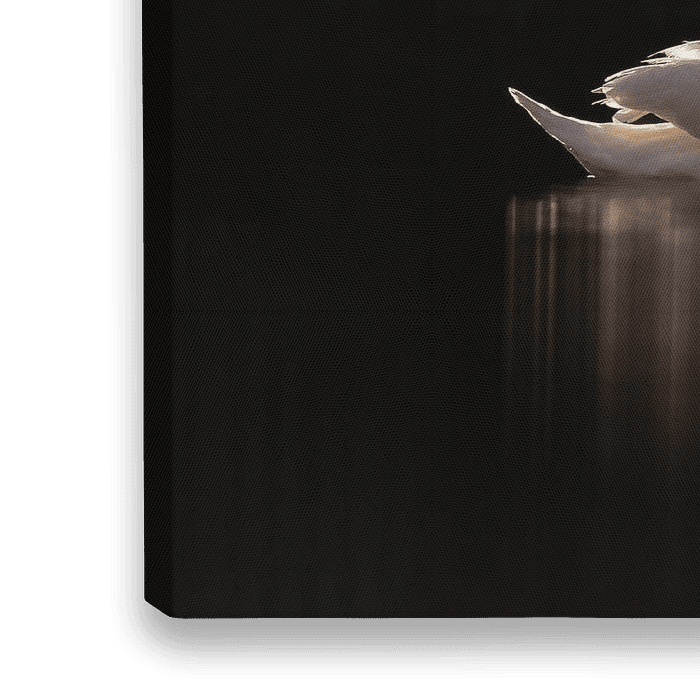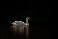 Een zwaan in rustig water waar weinig licht is en een zeer serene sfeer geeft. het randje licht om de contouren van de zwaan maken het geheel af. Het wit van de zwaan komt mooi uit in de donkere achtergrond.