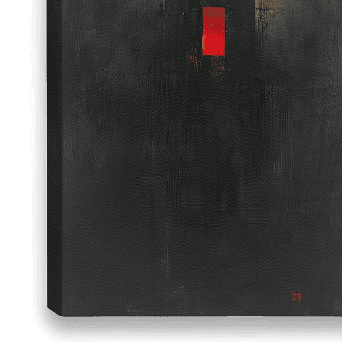 Details: modern, abstract, schilderij, rood, zwart, geel, textuur, contrast, canvas, kunst