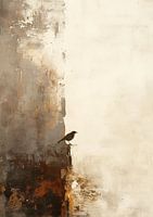 Zwart Dier - Op dit abstract schilderij zie je een klein, zwart dier, waarschijnlijk een vogel, dat op de rand van een lichte, crèmekleurige achtergrond staat, met daarachter aardetinten en vlekken die een natuurlijke uitstraling geven.