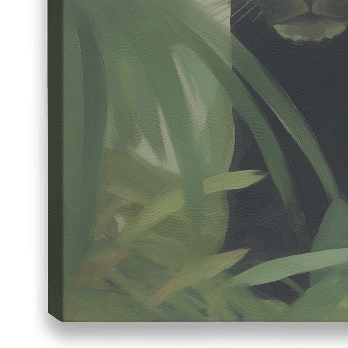 Een kleurrijk digitaal schilderij van een zwarte panter omringt door bladeren in het oerwoud. Het werk geeft een dromerige en klassieke uitstraling aan uw interieur!