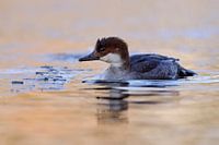 Zwergsäger / Smew ( Mergellus albellus ), female adult, swimming in freezing icecold water along the ice edge, winter guest in Western Europe, wildlife.