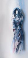 Abstract werk in blauw en zacht roze - vrouw in blauwe jurk in olieverf stijl. Langwerpig hoog en smal kunstwerk waarmee je de hoogte van een ruimte goed kunt benutten.