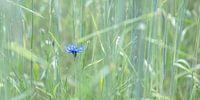 een enkele blauwe korenbloem tussen de blauwgroene stengels van rogge. Centaurea cyanus is de latijnse naam voor deze mooie veldbloem