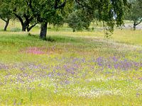 Onder de kurkeiken in het achterland van Portugal werd het gras gekleurd door allerlei wilde bloemen. Je moet wel in de lente komen om om deze zee van kleuren te zien.