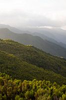 bomen op bergen. zonnestralen op de voorgrond. van Robinotof