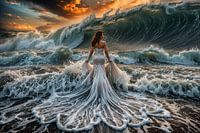 fotorealistische weergave van een fictieve bruid die in de branding staat op het strand met op de achtergrond een tsunami golf met een donkere dreigende lucht bij zonsonder- op zonsopgang. Haar trouwjurk gaat naadloos over in de golven die aanspoelen op het zeezand