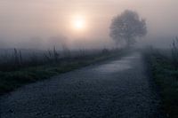 De dichte mist hult de omgeving in een dromerige sfeer, waar de zon doorheen probeert te breken,…