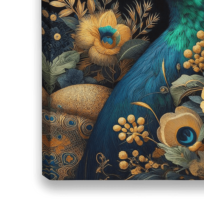 Koop dit bloemen kunstwerk digitale collage van majestueuze pauw tussen gekleurde bloemen en planten van Dutch Art Works op canvas, aluminium dibond, (ingelijste) fotoprint, behang en ArtFrame, op maat geprint in Fine-Art kwaliteit.