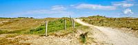 De Hollandse duinen langs de kust in panorama. Een beeld van een duinlandschap vanuit Noord-Holland. Den Helder om precies te zijn, met rechts een wandelpad door het duin.